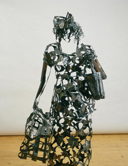 Camp is a prolific Nigerian sculptor from Buguma who studied at the California College of Arts and Crafts in Oakland, Central School of Art and Design, and the Royal College of Art in London, where she currently resides. Her sculptures often depict Kalabari (the town from which Douglas Camp comes) masquerades, spirits, or priestesses. Made of steel and other found materials such as cans, rope, and feathers, connects herself and represents her roots in these figures.